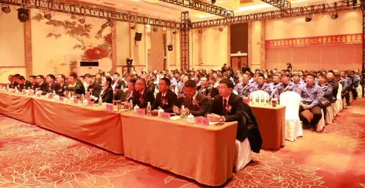双环传动总经理MIN ZHANG,双环传动副总经理、江苏双环董事长蒋亦卿,江苏双环总经理卢浩,副总经理汪土华、赵俊杰、陈香籽,江苏双环各部门长及公司2022年度先进人物、获奖代表、10-20年工龄奖获得者和部分员工代表共200余人出席了此次会议。