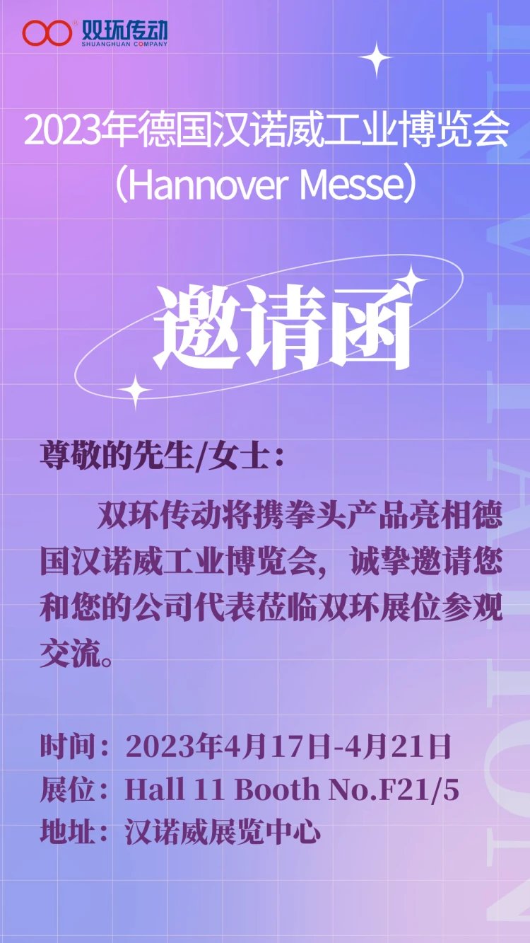 2023年德国汉诺威工业博览会(Hannover Messe)即将于4月17日-4月21日在汉诺威展览中心拉开大幕,双环传动将携高速低噪、安全低碳的产品在Hall 11 Booth No.F21/5展位亮相。