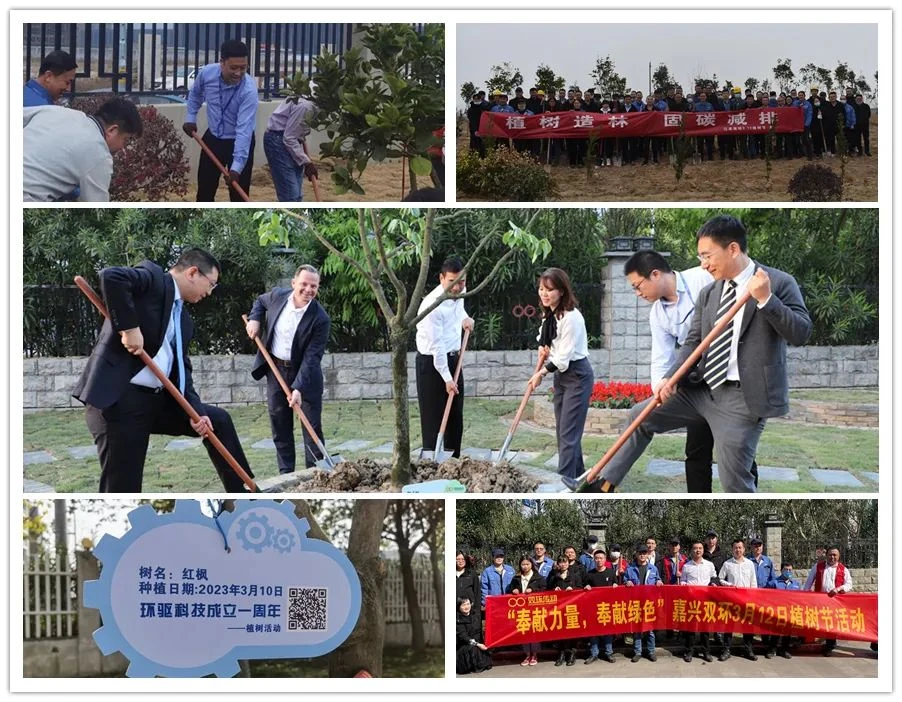 高层领导以身作则。从双环传动董事长吴长鸿、总经理MIN ZHANG等高层领导到子公司总经理,大力宣贯低碳理念,带头开展植树活动,用绿色装点双环厂区,在内部积极宣贯绿色意识,将绿色环保理念根植于每个员工心中;邀请客户共建双环友谊林,以生机和绿色见证生生不息的双方情谊。各基地积极开展丰富多彩的环保宣传和植树等活动,传递环保理念,播种绿色发展梦想。