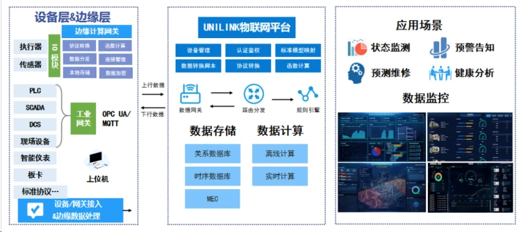 在工业互联领域,IOT&ICP工业物联与智算平台可实时监测设备利用率,及时发现设备问题,优化能源供需和利用效率;采用云、边、端三级协同技术架构,形成业务数据自下而上、由繁至简、由浅至深的处理模式,集工业物联与业务赋能为一体。