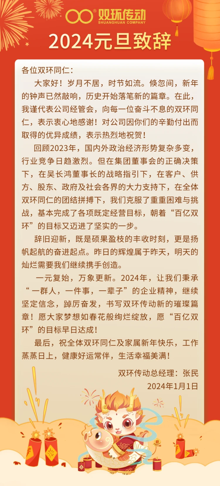 双环传动总经理张民2024年元旦致辞
